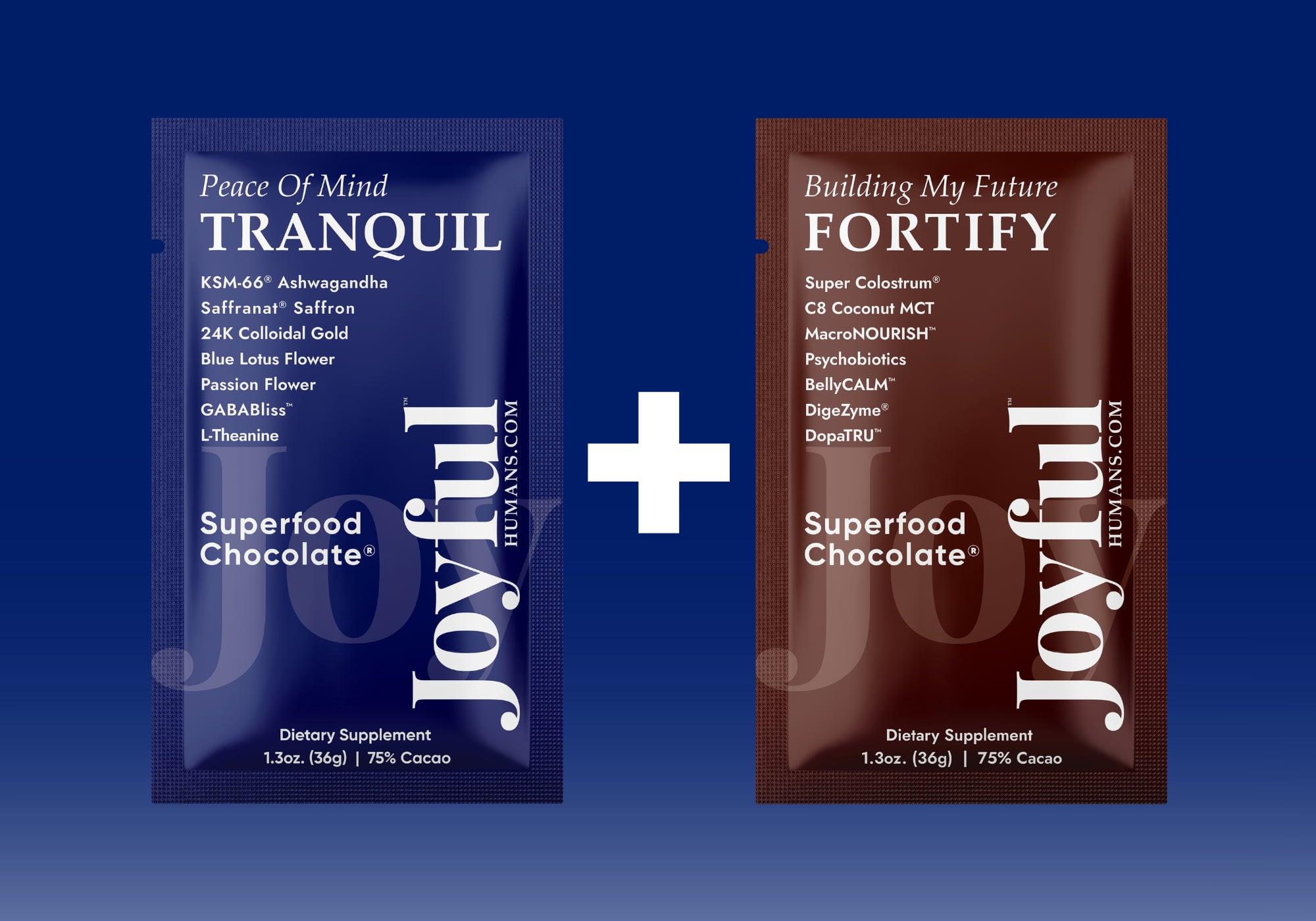 Meet Tranquil™ and Fortify™ - two elevated Superfood Chocolate® bars designed to support modern minds and resilient bodies. Tranquil™ melts stress, calms the nervous system, and supports deep, restorative balance.